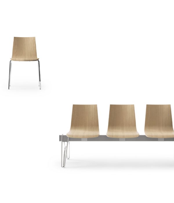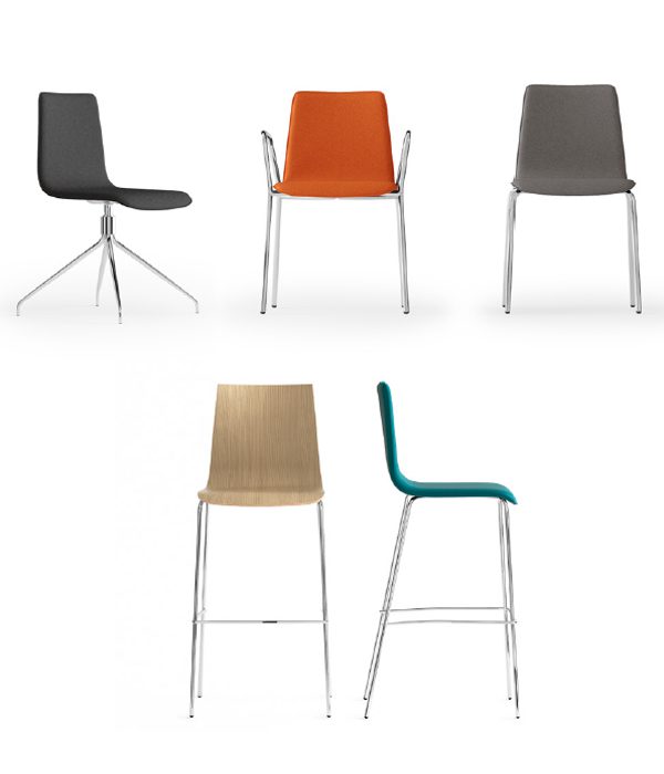 Διατίθεται με πλήθος επιλογών υλικών του καθίσματος (ξύλο οξιάς ή υπενδεδυμένο κόντρα πλακέ οξιάς σε διάφορα χρώματα, υφές και σχέδια),  και του σχήματος της βάσης (4 μεταλλικά πόδια, τετράκτινη πυραμίδα, μπάρα καναπέ, ή σταθερή βάση σκαμπώ) κάνοντας το ένα πραγματικά πολυκάθισμα για κάθε χρήση.
